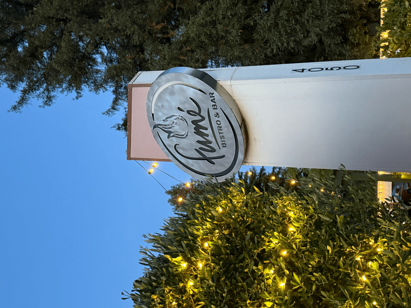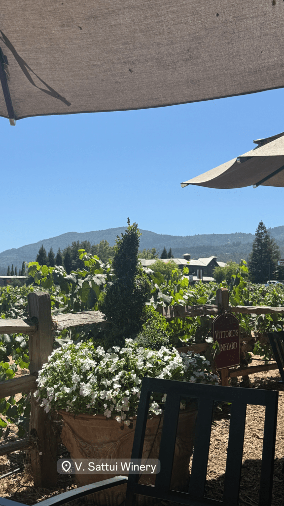 At V. Sattui, we did a 5-wine tasting; Harry went for reds, I went for whites. The winery looked like a Spanish-style villa and had a full deli and market on site. We didn’t buy anything there (prices were steep), and instead headed back to the hotel to relax and get ready for dinner at Fumé, a local favorite.