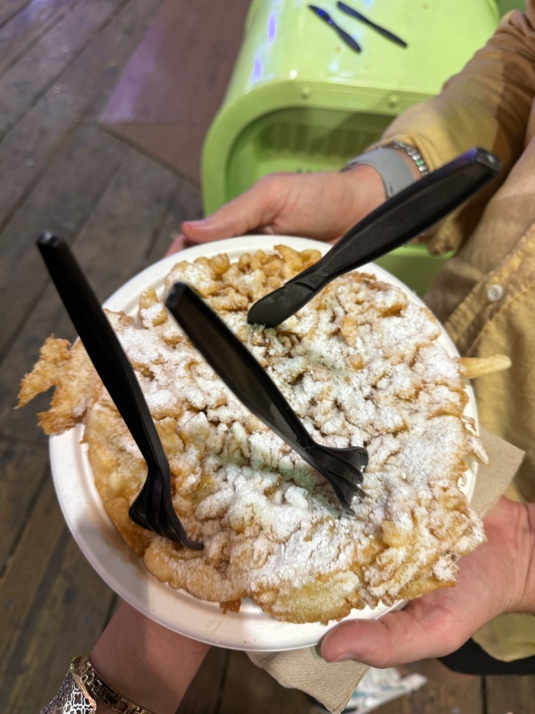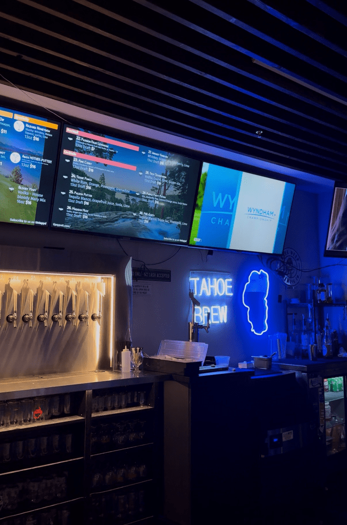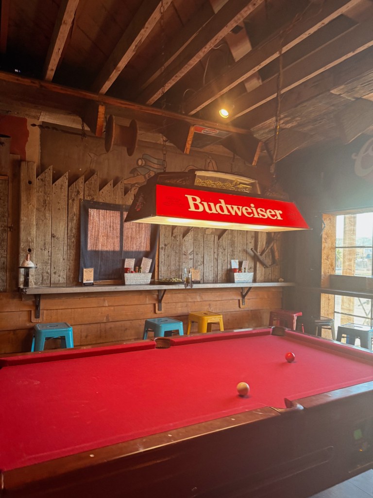 We headed back to the hotel around 4:30 PM to shower and get ready for the night. Dinner was at Becket Tavern, a BBQ spot Harry had spotted on the drive in, and it delivered. We sat on the patio with live music, and I had the Smokin’ Chicken Caesar, while Harry got a pulled pork grilled cheese with fries – yum. After dinner, we wandered around Heavenly Village and stumbled into Tipsy Putt – a bar with mini golf and cornhole. There was a bar crawl coming through, so we couldn’t golf, but the host was so sweet and gave us other games to play inside. We ended up staying and having such a good time.