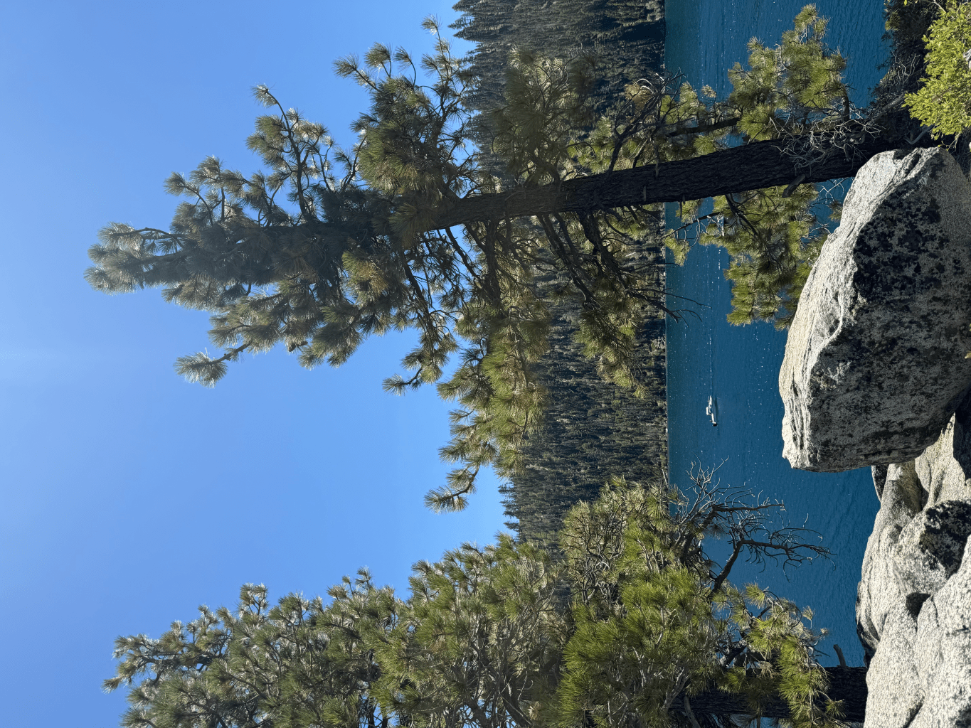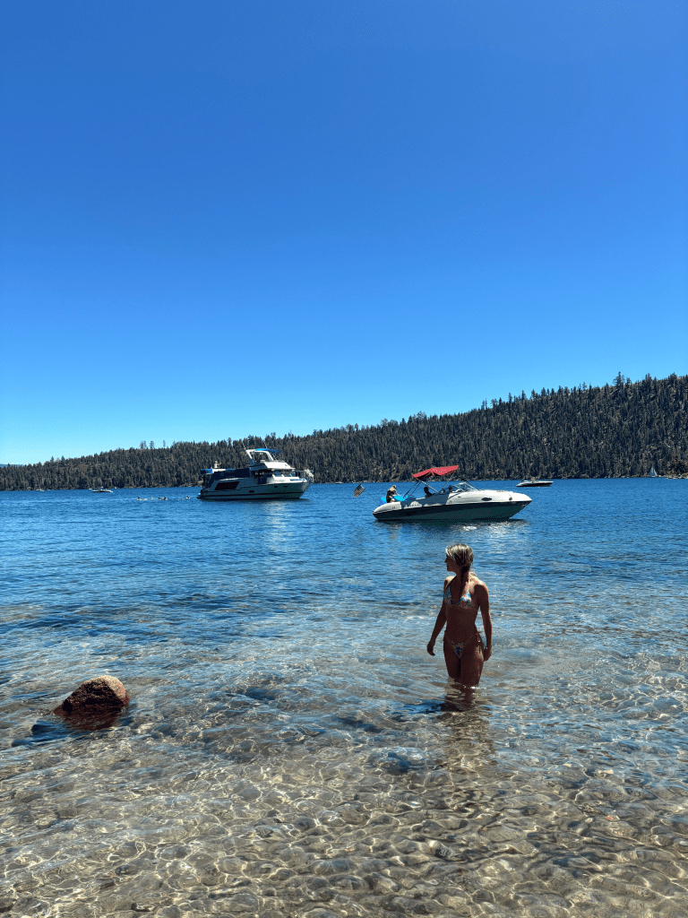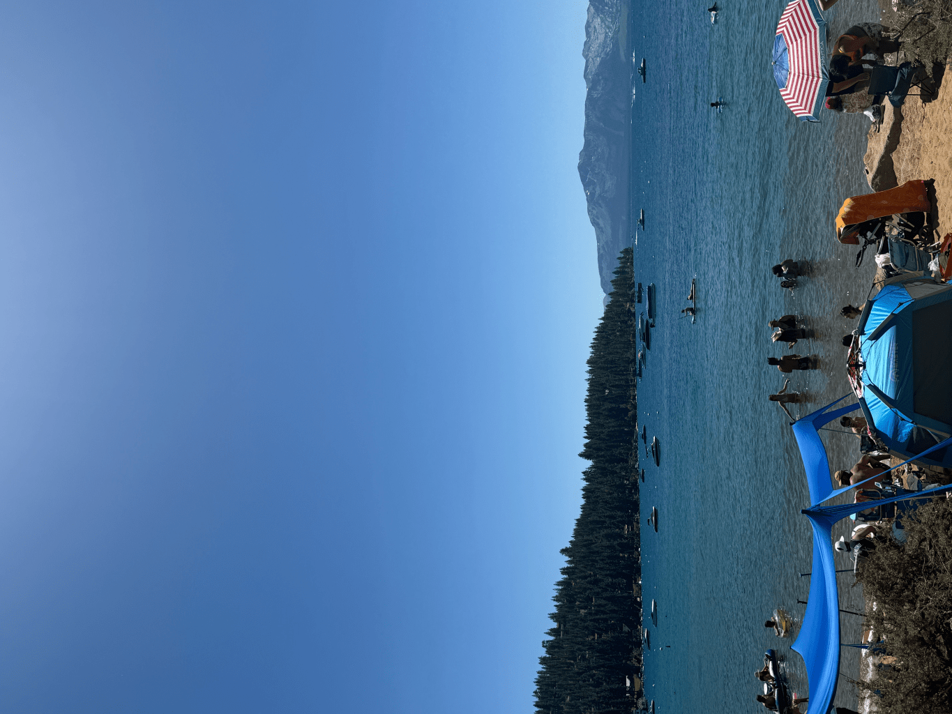 We found a tucked away spot down the trail from the main beach and set up in a grassy area with everyone else. The views were unreal. The water? Even better. Lake Tahoe is glacial so it was freezing, but so refreshing in the heat. We ran straight in and later scrambled over to some rocks nearby where people were sunbathing or cliff-jumping. It was too hot for the sand, so we sprawled on the rocks for a while.