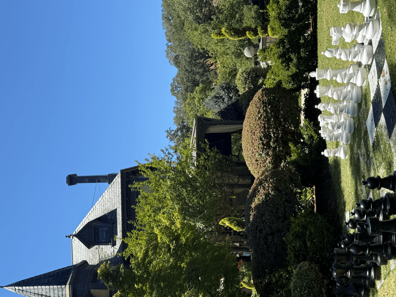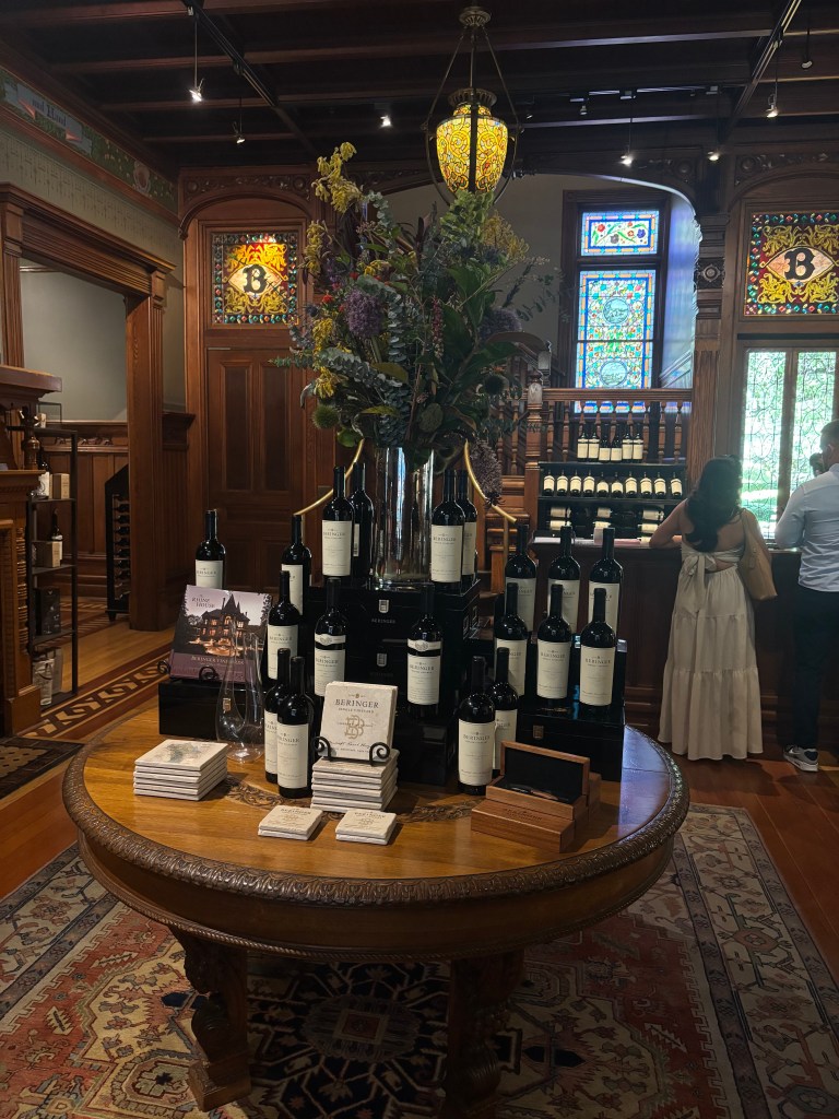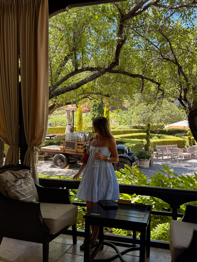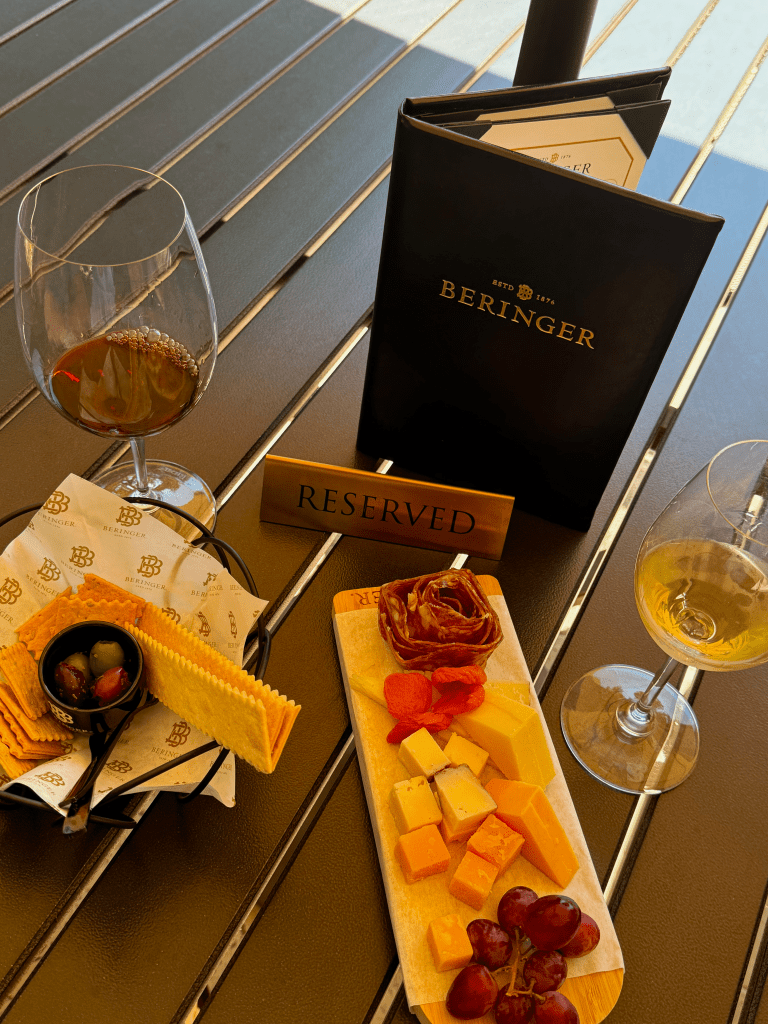 Our first tasting was at Beringer Vineyards (11:30 AM). We chose an outdoor tasting with a charcuterie board, and the pairing were insane. The cheese and wine combos were elite. Afterward, we strolled through their storybook-style garden – like straight out of Alice in Wonderland.