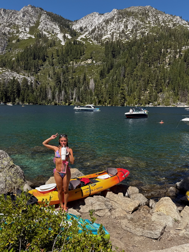 The hike down to the Emerald Bay Beach area took about 20 minutes, and once you reach the bottom, there are options to explore the castle or head to the beach where you can rent kayaks. We rented a double kayak for two hours ($80 total) – honestly such a steal. We paddled out to the little island in the middle of the bay, where people had docked their kayaks and boats. There’s a small climb up to a tiny ruin-like structure at the top, with some of the most beautiful views of the mountains surrounding the water.